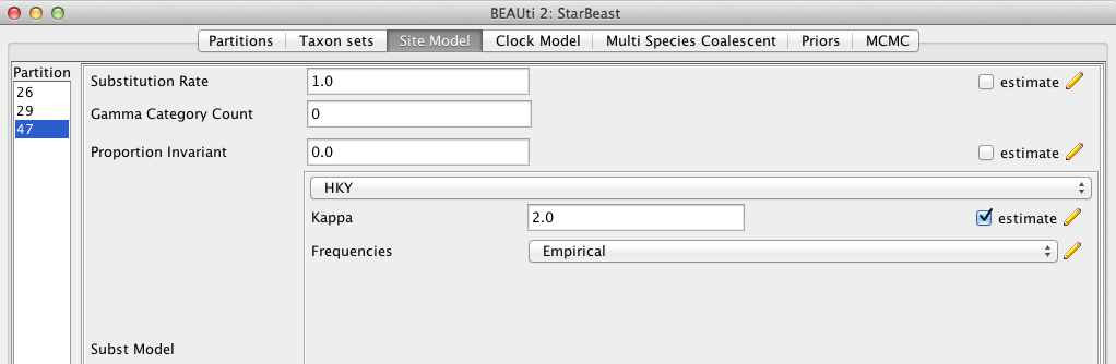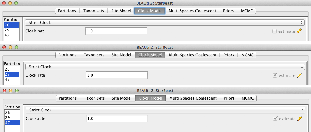 The estimate check box is unchecked for the first clock model and checked for the rest clock models, because we wish to estimate the substitution rate of each subsequent locus relative to the first locus whose rate is fixed to 1.0.