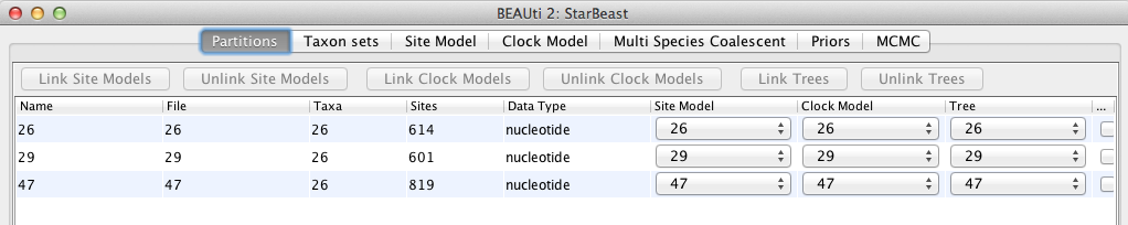 For multi-locus analyses, BEAST can link or unlink substitutions models across the loci by clicking buttons on the top of Partitions panel. The default of *BEAST is unlinking all models: substitution model, clock model, and tree models. For this tutorial we shall leave all models unlinked.