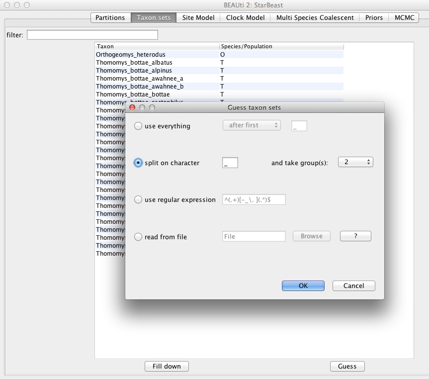 Alternatively, pressing the Guess button in BEAUti, a dialog is shown where you can choose from several ways to try to detect the species from the name of the taxon. In our case, splitting the name on the underscore character (_) and selecting the second group will give us the mapping that we need (Figure 3).