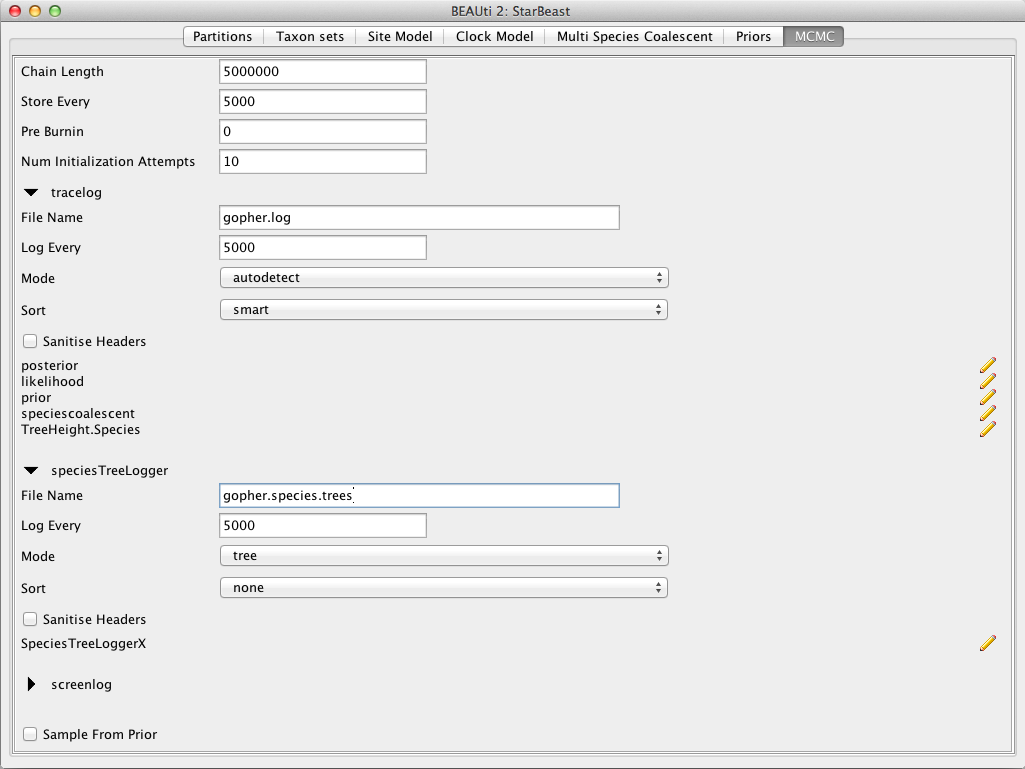 Set the file name of the tracelog to gopher.log, that of the speciesTreeLogger to gopher.species.trees, and that of the treelog.t:26, treelog.t:29, treelog.t:47 to gopher.gene$(tree).trees.
