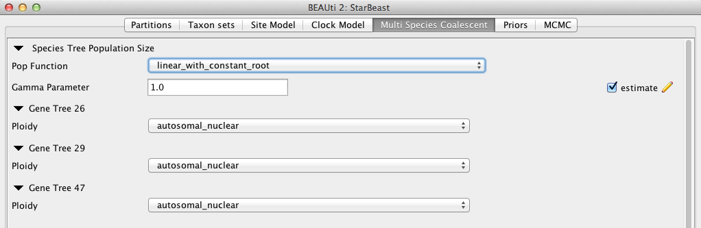 Currently, three population size models for species tree (under the entry Pop Function) are available: Continuous-linear and constant root, Continuous-linear, and Constant. In this analysis, since we don’t have much information for the population change at the root, we use linear and constant root model.