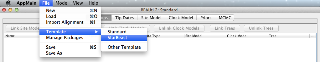 *BEAST uses a non-standard template to generate the analysis XML, which means that to use BEAUti for *BEAST, the first thing to do is to change the template. Choose the File/Template/StarBeast item (Figure 1). Keep in mind that when changing a template, BEAUti deletes all previously imported data and starts with a clean template. So, if you already loaded some data, a warning message will pop up indicating that this data will be lost if you switch templates.