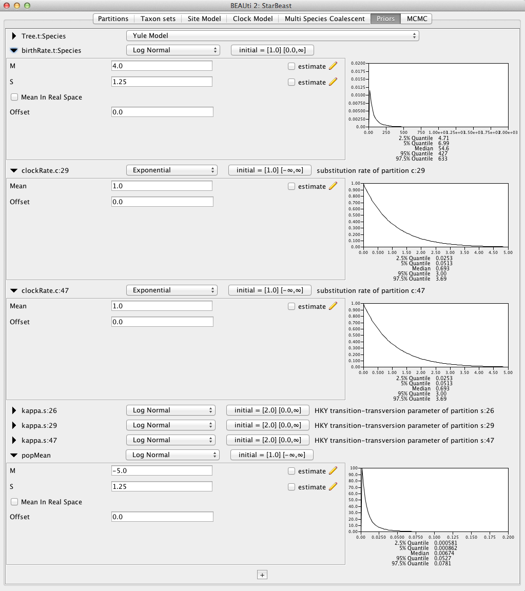 Log Normalwith M of 4.0 and S of 1.25; - popMean (scale parameter of the gamma priors for population sizes): set the prior to