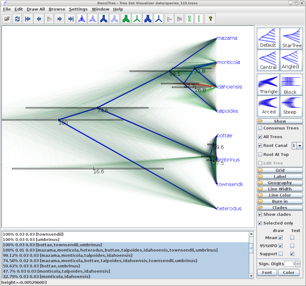 You can see that there is information for too many clades being displayed. As most clades have very little support, they are not of interest and we would like to stop visualizing the information for those. Tick Selected only, then open the clade toolbar (menu Window/View clade toolbar), and select only highly supported clades (hold down theshiftkey to select several clades at a time). Also, select the clade consisting of heterodus, bottae, umbinus and townsendii, to show that heterodus is an outgroup of the tree, but there is some support ( 17%) that it is not. -