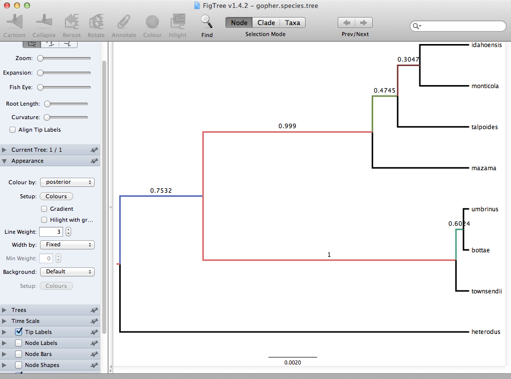 Finally, we can look at the tree in another program called FigTree. Run this program, and open the gopher.species.tre file by using the Open command in the File menu. The tree should appear.