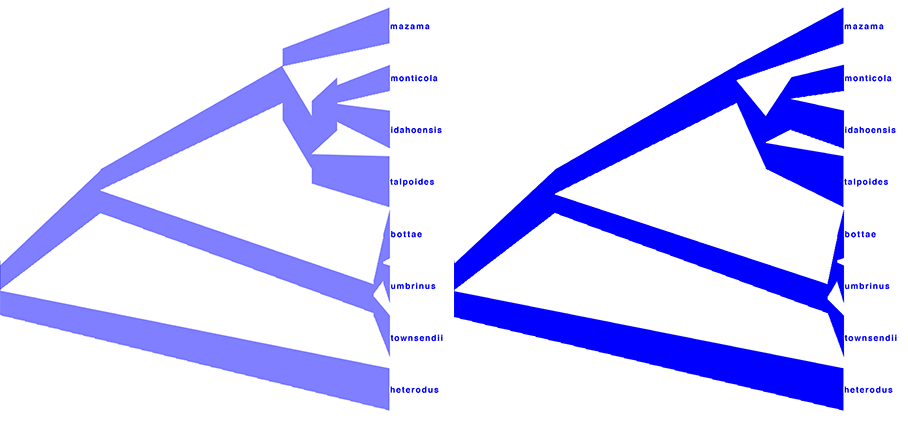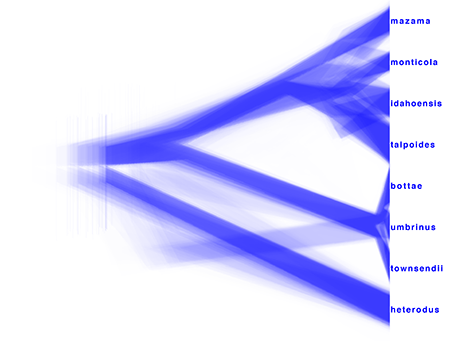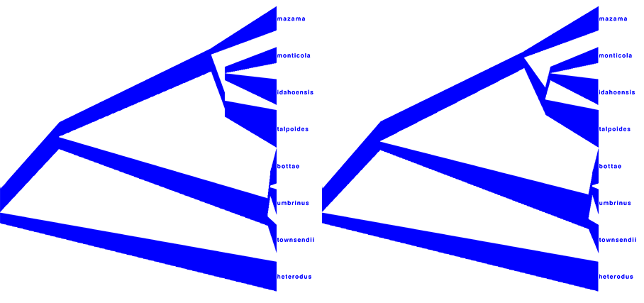 Similarly, DensiTree can be used to show the population sizes of the summary tree gopher.species.tre from TreeAnnotator.