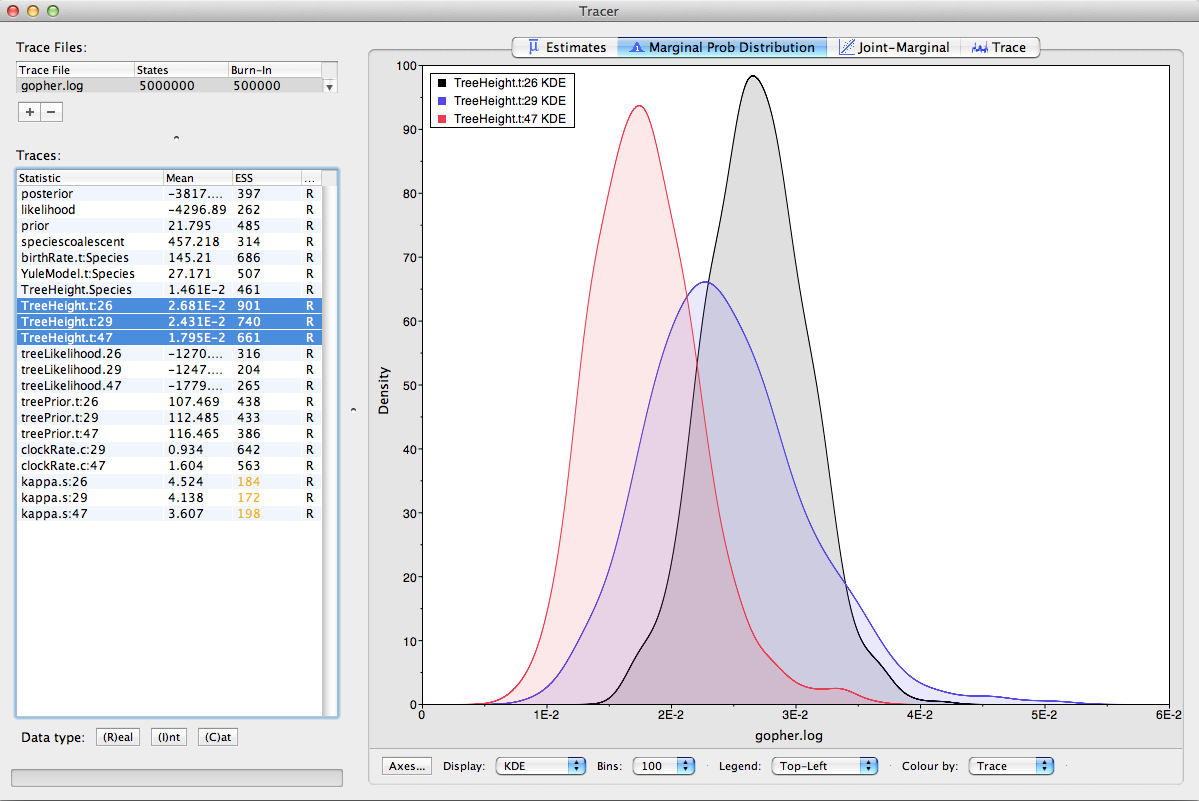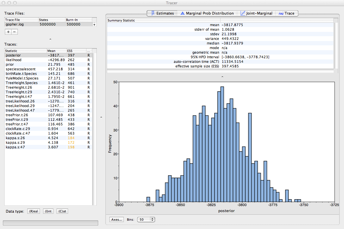Run the program called Tracer to analyze the output of BEAST. When the main window has opened, choose Import Trace File… from the File menu and select the file that BEAST has created called gopher.log.