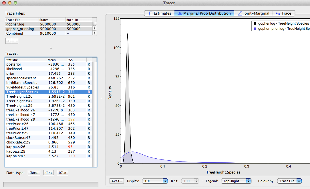 Figure 18 shows an example of comparing the traces of the species tree height. From the plot we can conclude that the sequences contain quite a bit of information about this parameter, as the posterior moved away from the prior and is much more focused on a specific value.