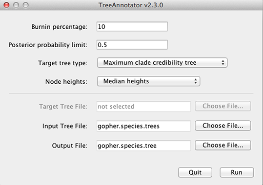 For the input file, select the trees file that BEAST created (in this tutorial this was the gopher.species.trees) and select a file for the output (here we called it gopher.species.tre).