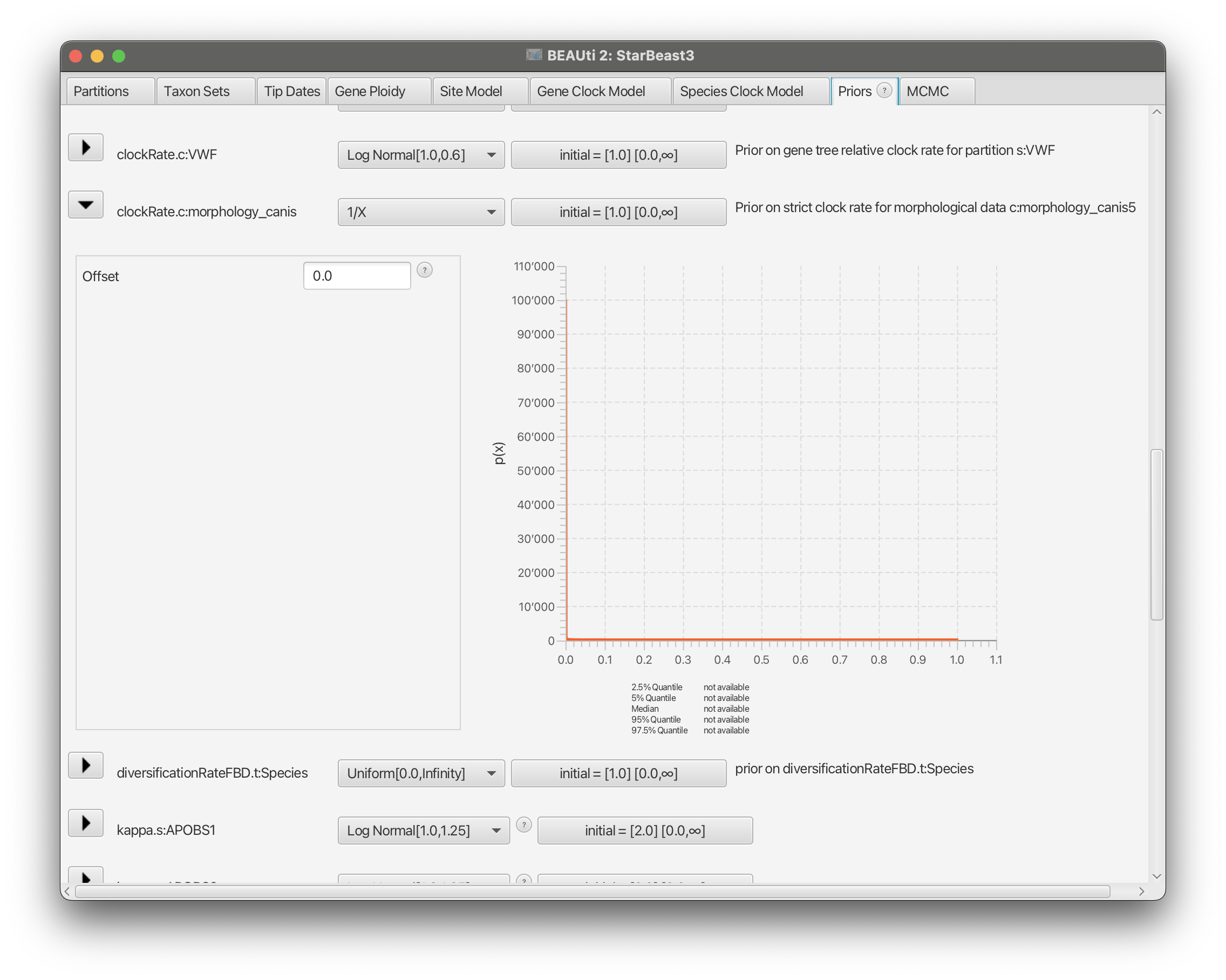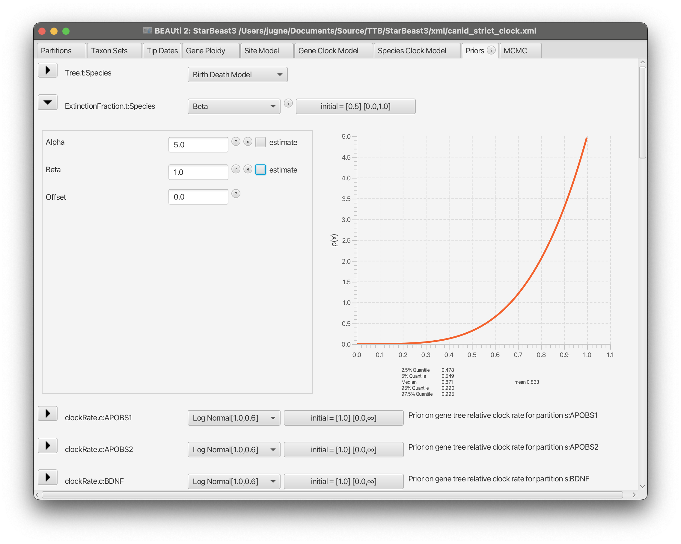 For ExtinctionFraction, expand the prior and uncheck the estimate checkbox for alpha and beta parameters (Figure 8). We do this since the default prior is good enough and analysis can run faster.