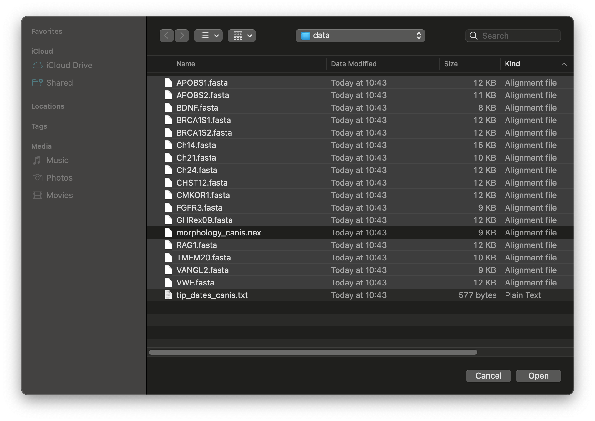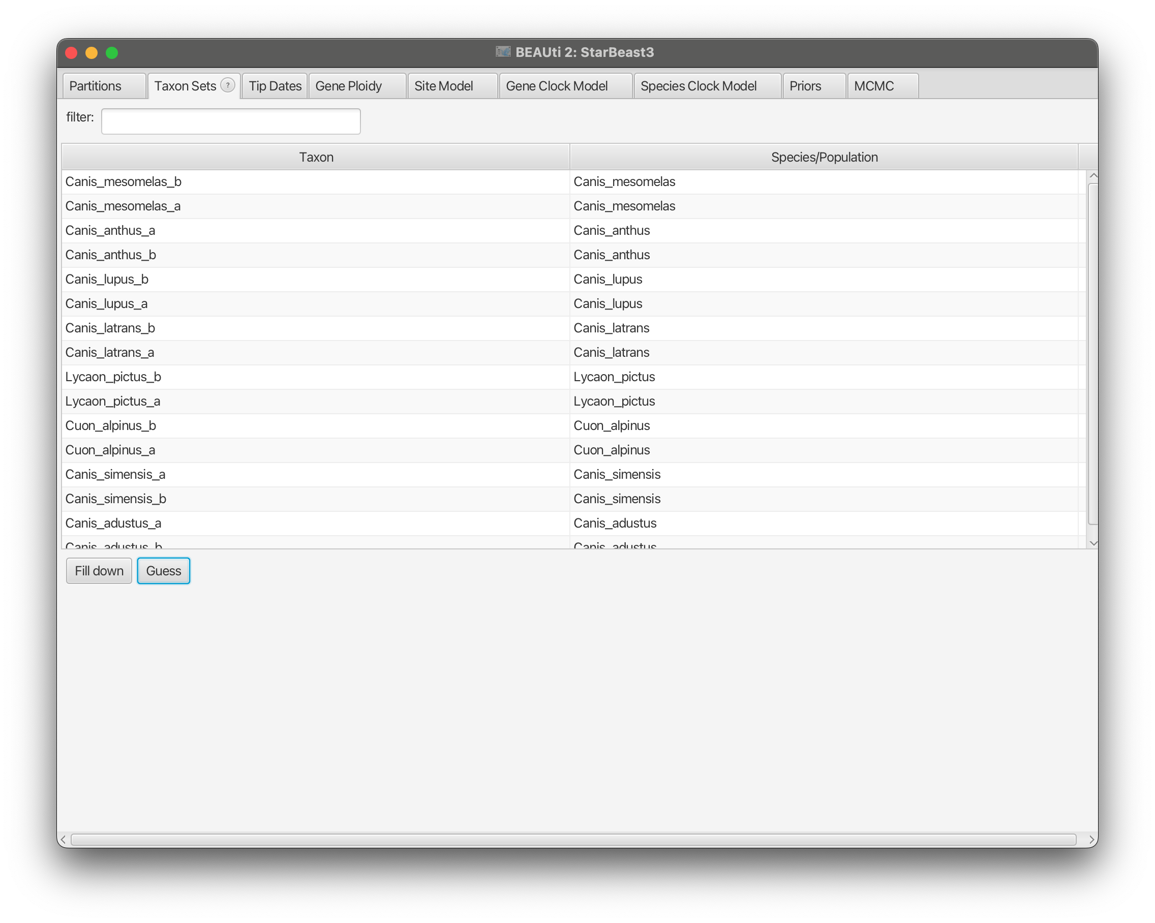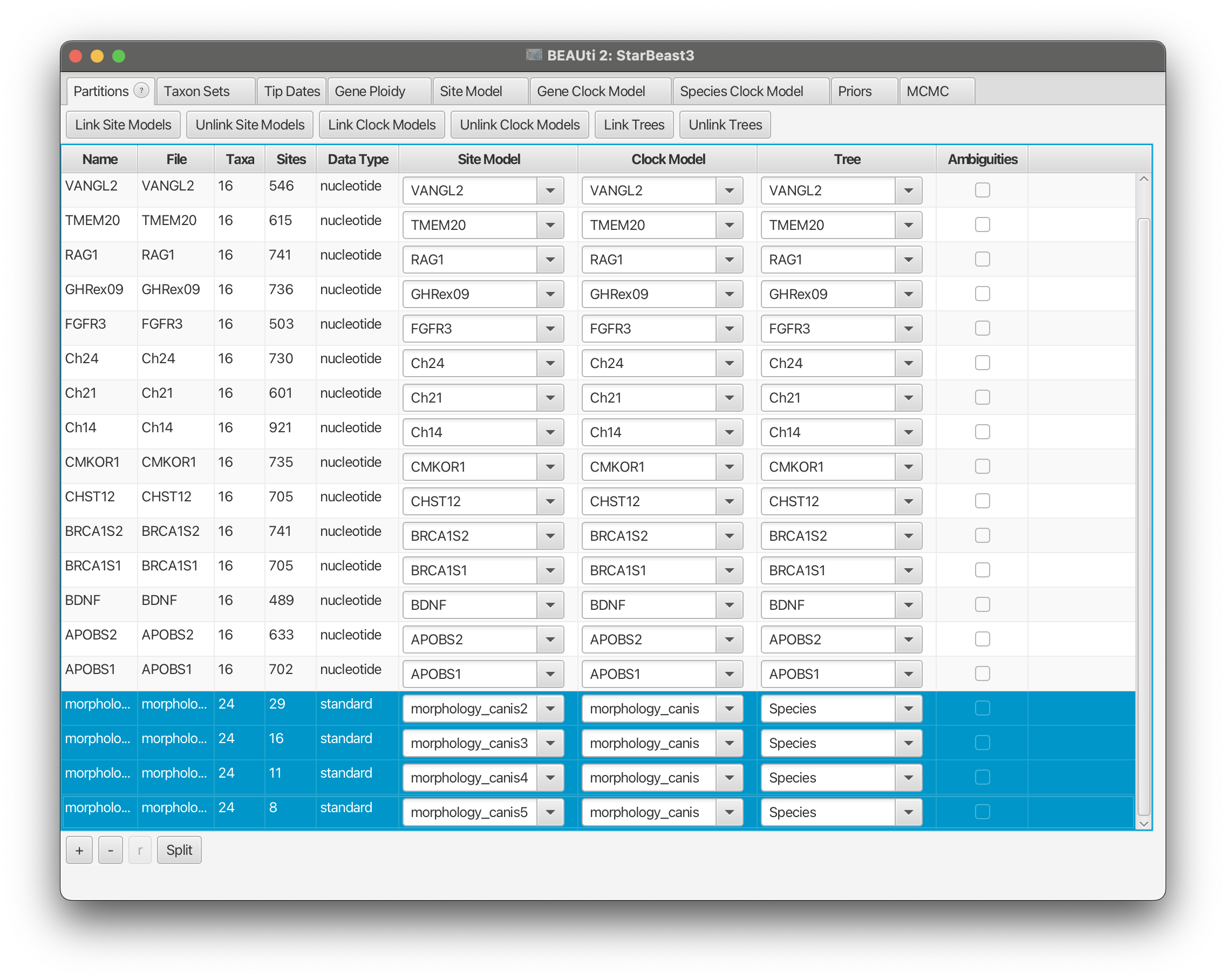 In this tutorial we will reconstruct species tree of Canis genus - a group of mammals which includes wolves, domestic dogs, coyotes, and jackals. We will analyse 24 species, 8 out of which are extant. We will use 16 nuclear loci (Lindblad-Toh et al., 2005) for extant taxa in the first two analyses. We will add 50 morphological characters data for all 24 taxa for the total evidence analysis. Before proceeding with the tutorial you should download all the data. You may browse these data using your preferred alignment viewer before proceeding with the tutorial.
