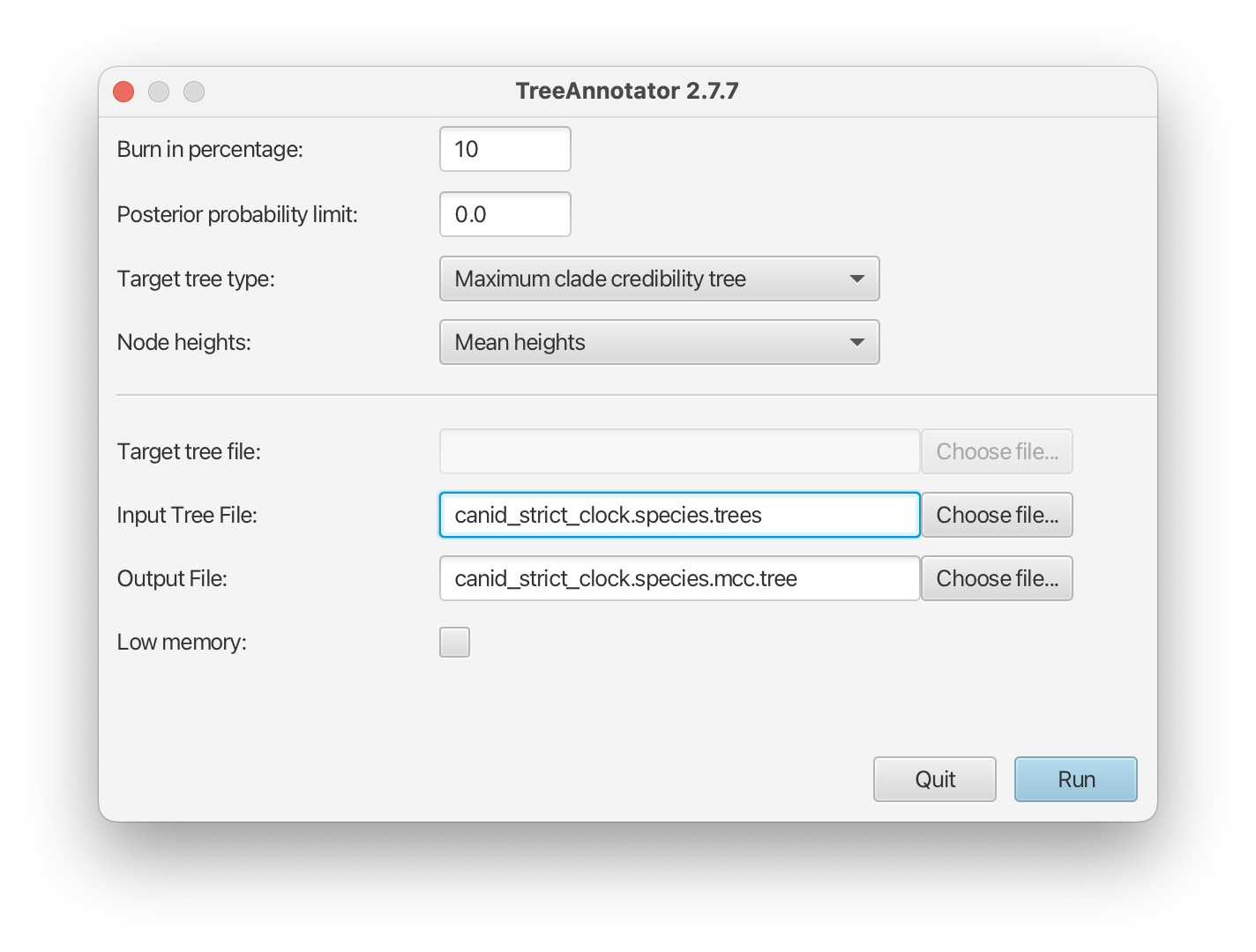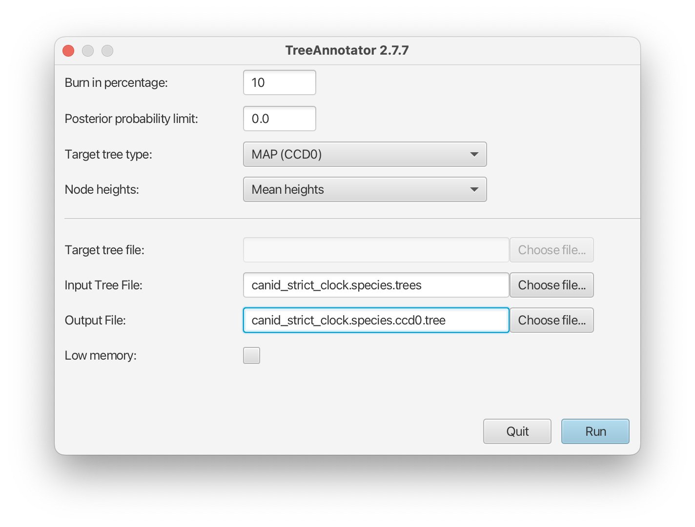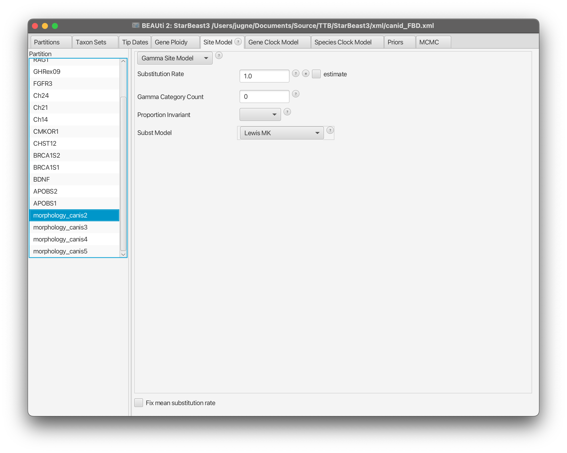 You are ready to set up the names of your files, run length and logging frequency. We used name canid_FBD for all log and tree files. The analysis which results are provided in the pre-cooked runs was run for 10^8 iterations and logged every 3*10^3 iterations. This results in about 2.5-3 hour runtime. You may therefore run the analysis for shorter time to make sure it works and explore the results from the log files we provide.