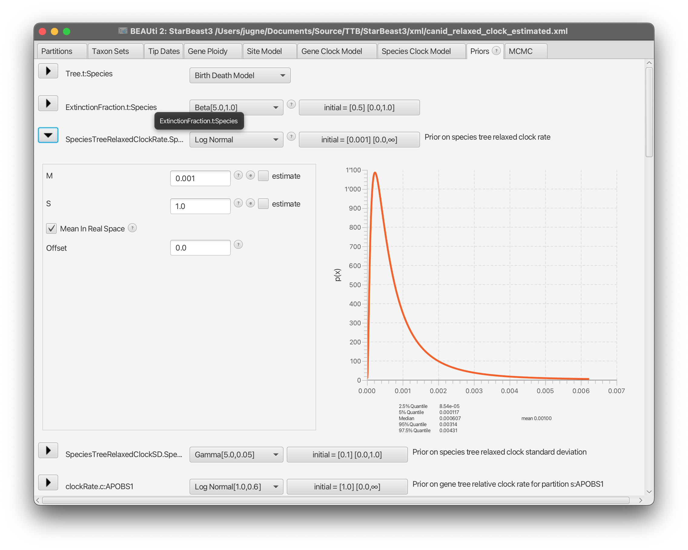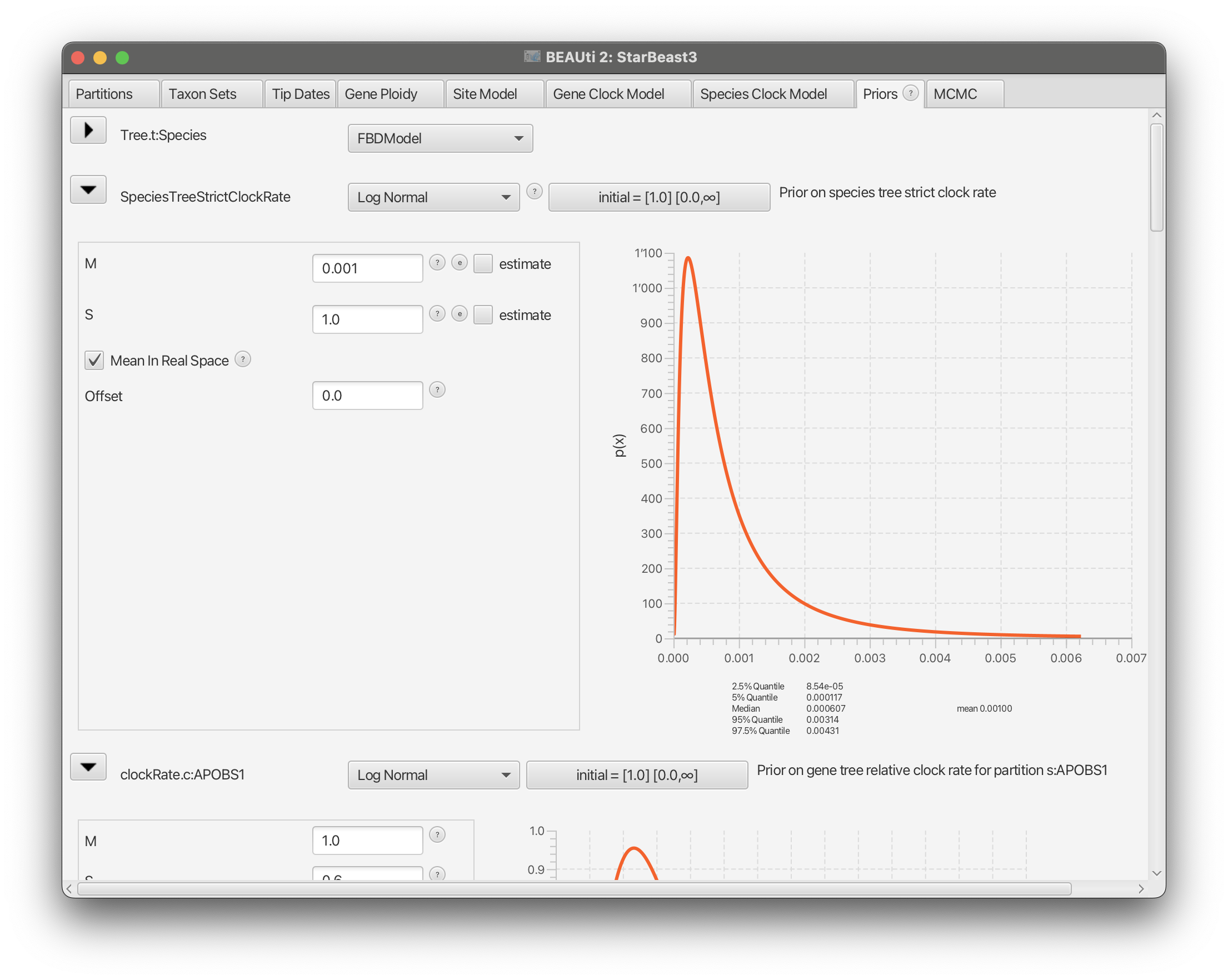 Assign a LogNormal(M=0.001, S=1) prior to SpeciesTreeRelaxedClockRate.Species. Ensure that Mean in Real Space is checked (Figure 17).