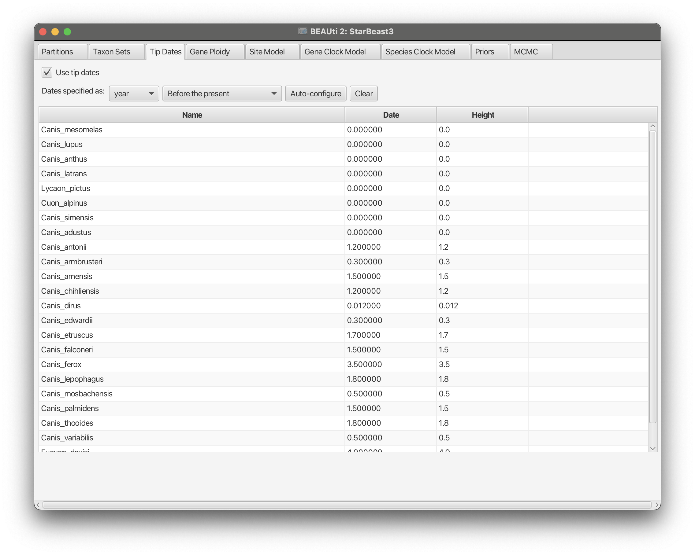 Toggle read from file, select Browse and navigate to provided file tip_dates_canis.dat