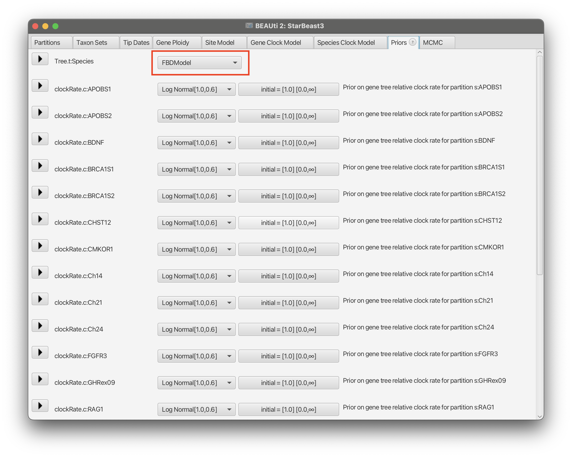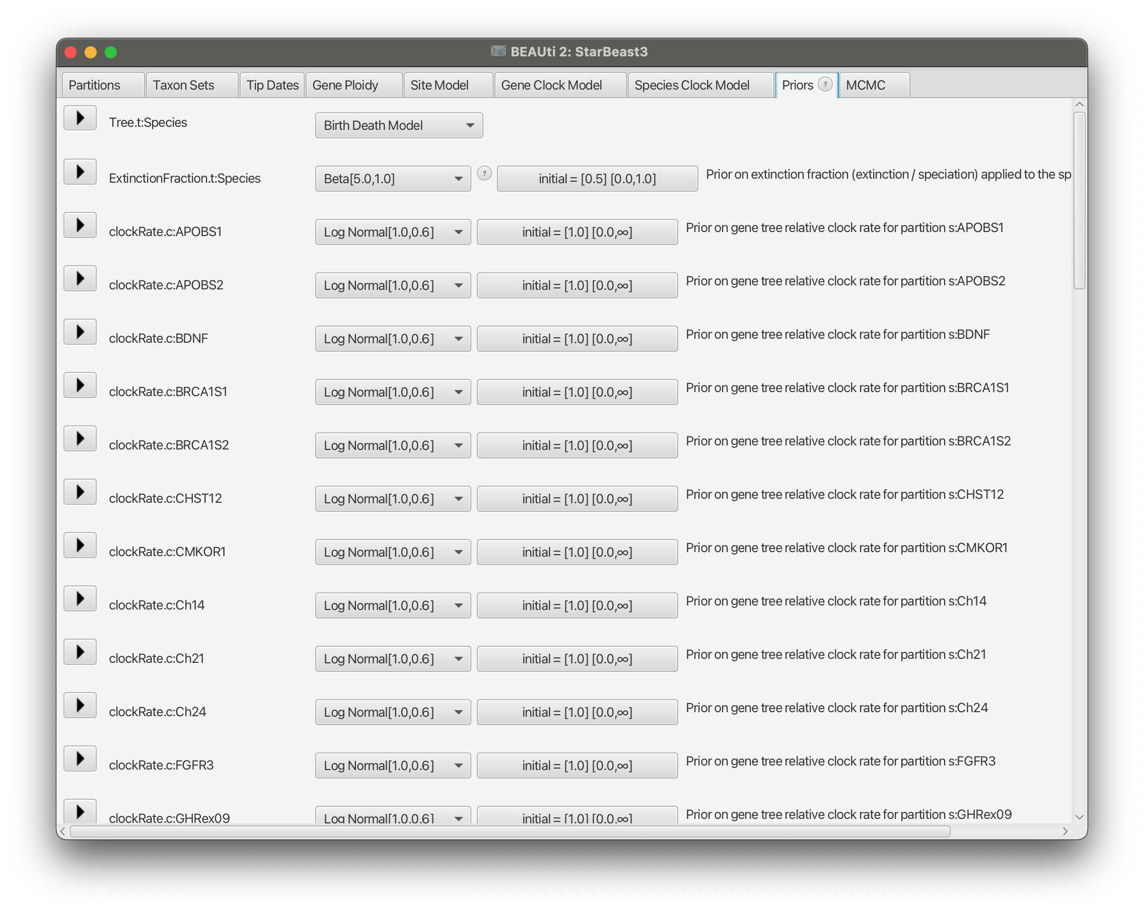 - Clock rate: relative clock rate for each loci and overall species tree clock rate. Here, we do not estimate species clock rate therefore you do not see a prior for that rate in the list.