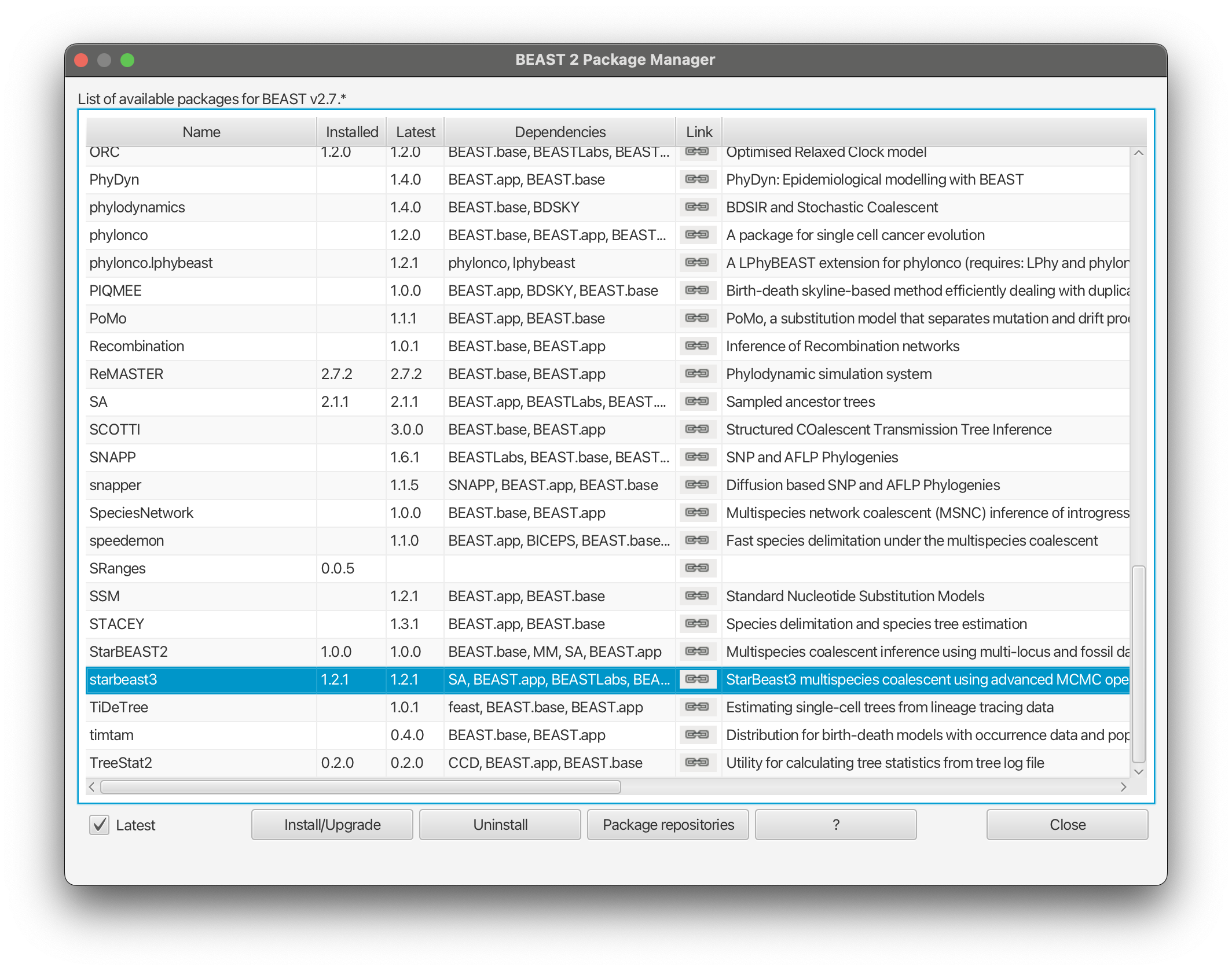 The new window with the list of all packages will open. Scroll down the list and select starbeast3. Click Install/Upgrade to install the package (see Figure 1). This will also install all the packages StarBeast3 depends on (if not already installed).