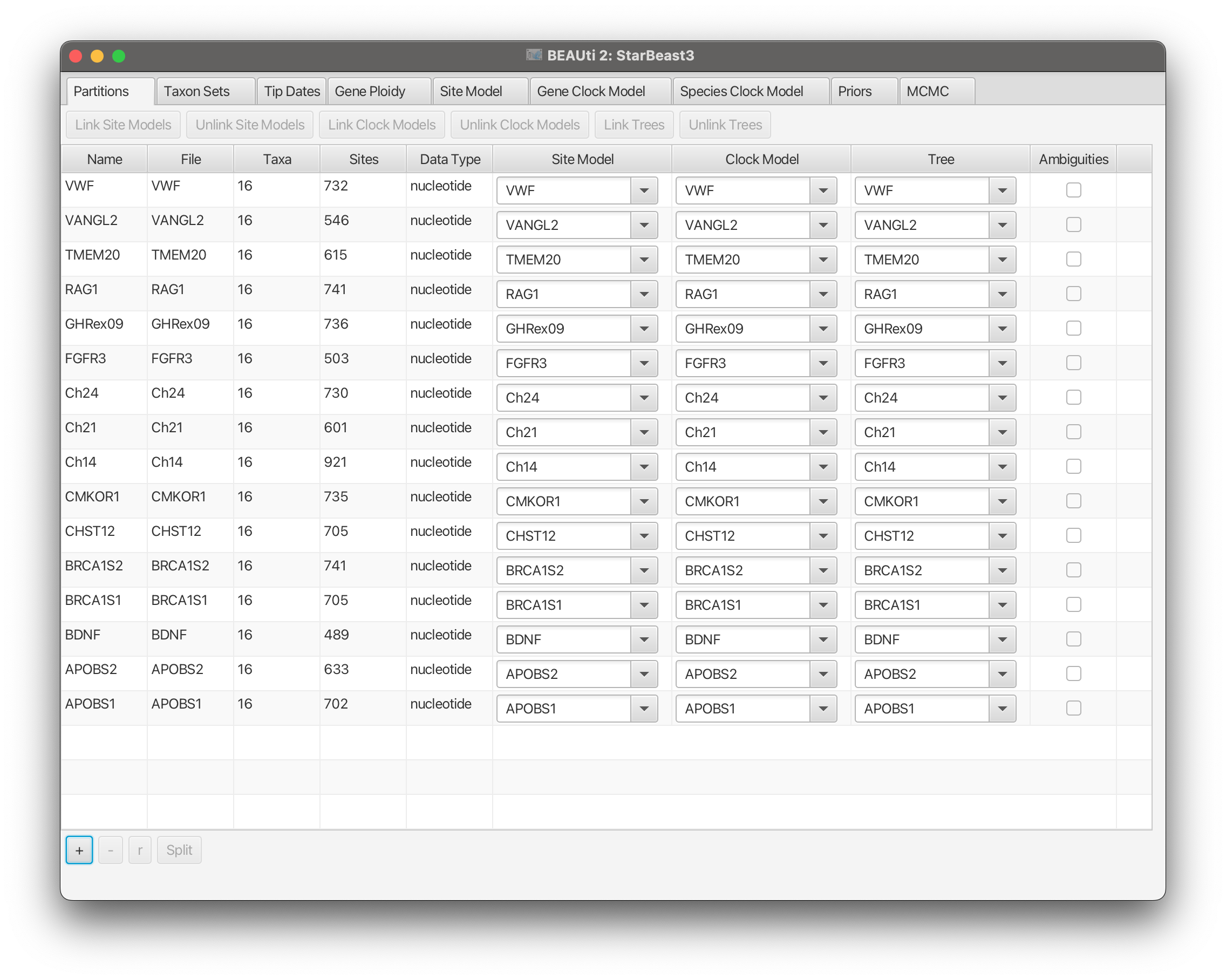There should now be 16 partitions listed in BEAUti (Figure 3)