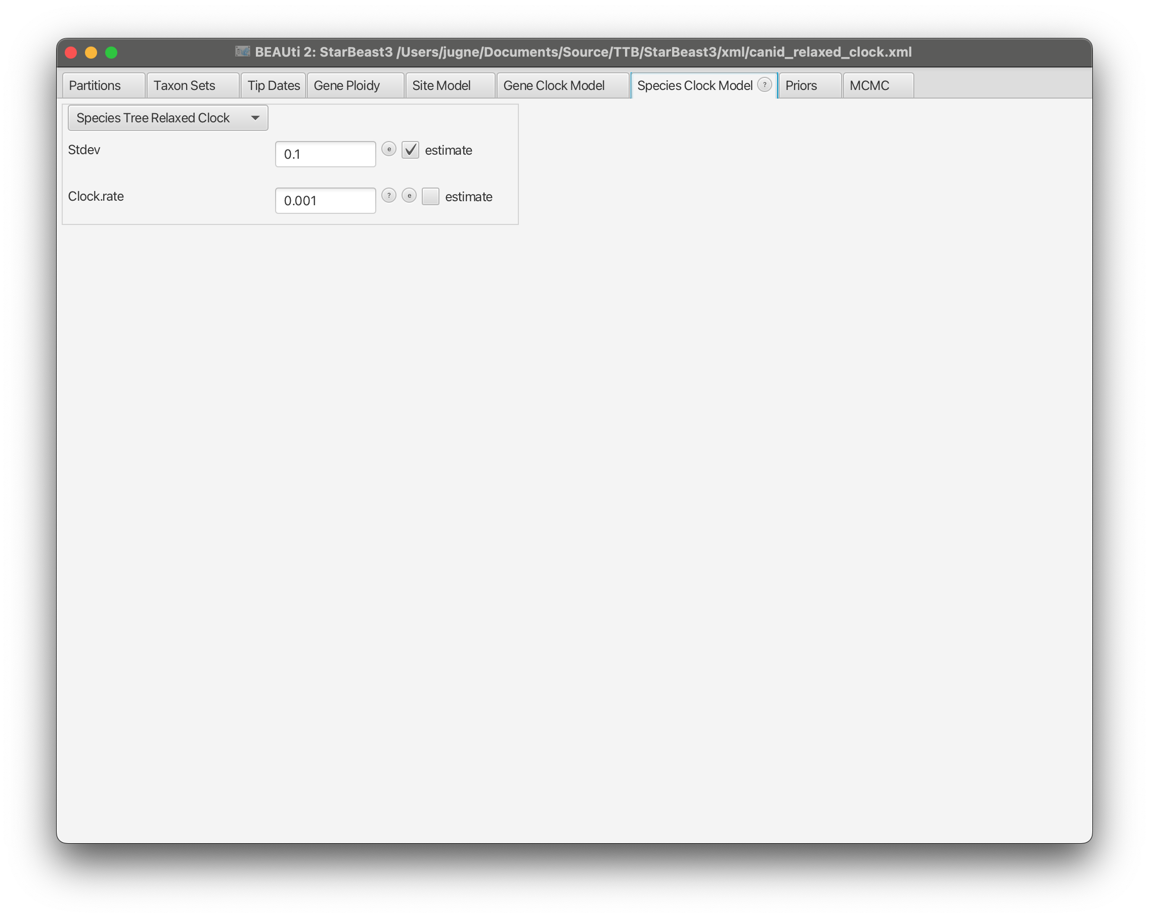 - You may also use relaxed clock for morphological data, instead of a strict one. However, at the moment this requires to edit the XML file by hand. Make sure you are using appropriate species tree clock from the StarBeast3 package. Also, be careful to not include any operators that would break the dependence between species and gene trees.