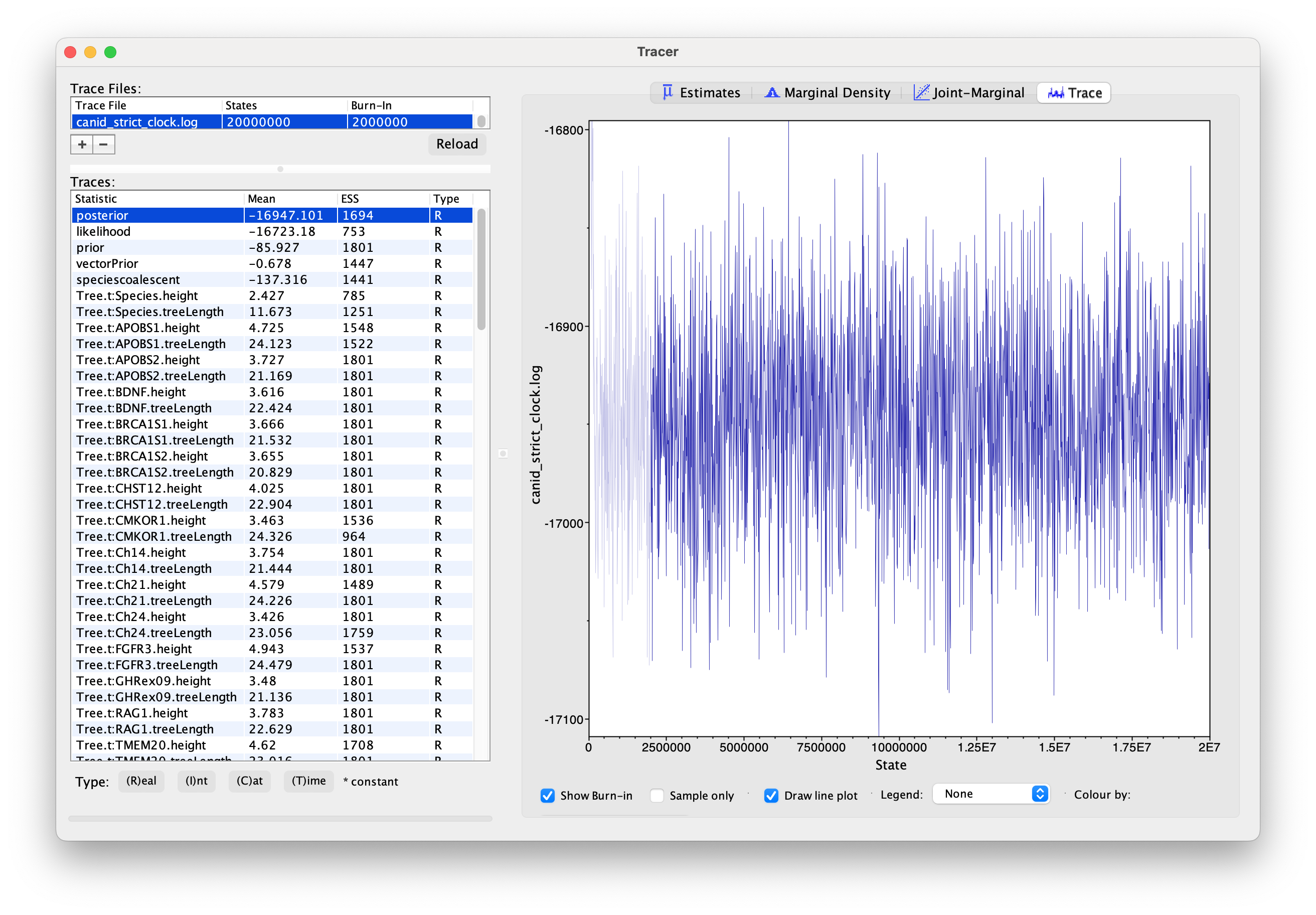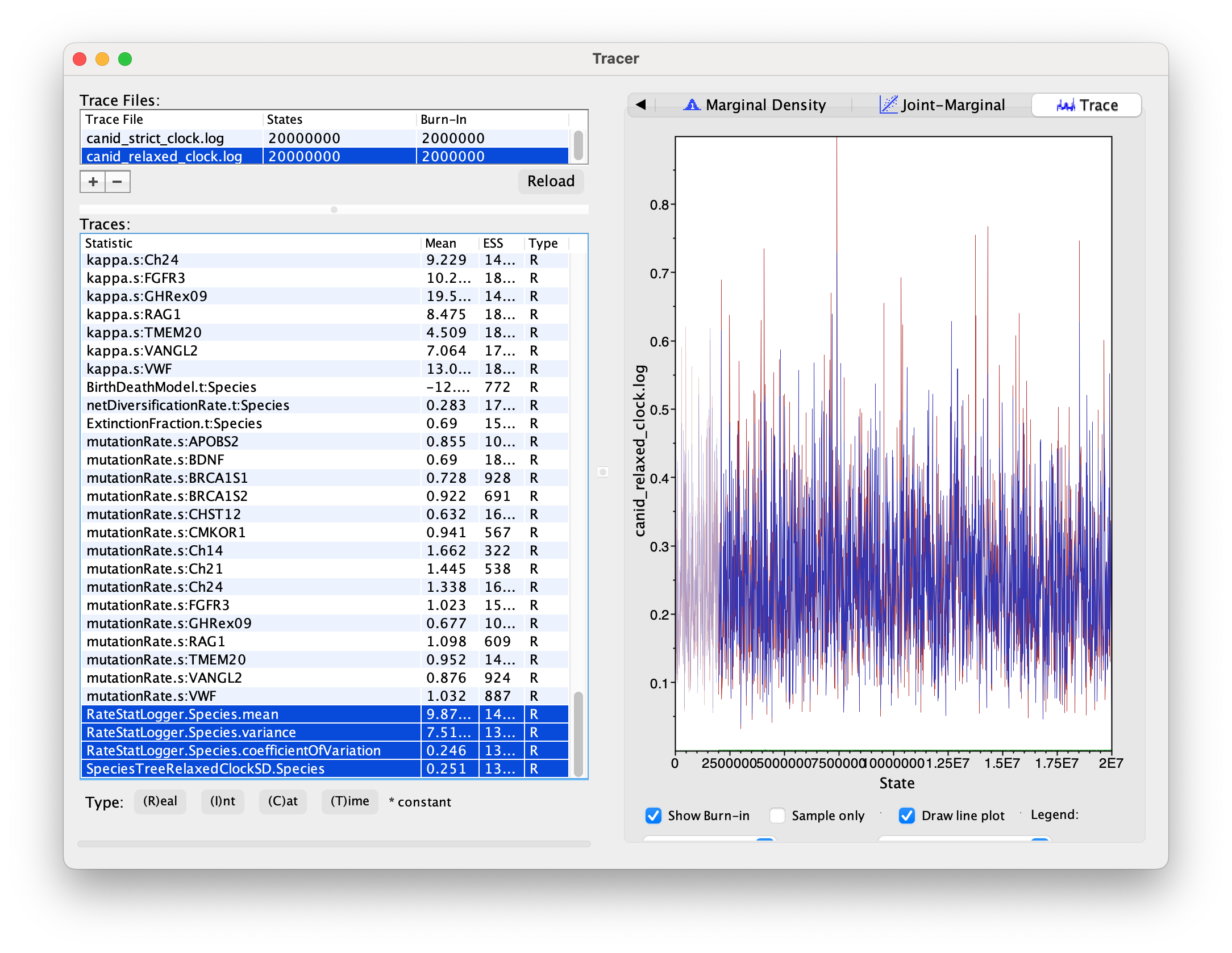 Drag and drop canid_relaxed_clock.log on the Tracer window.