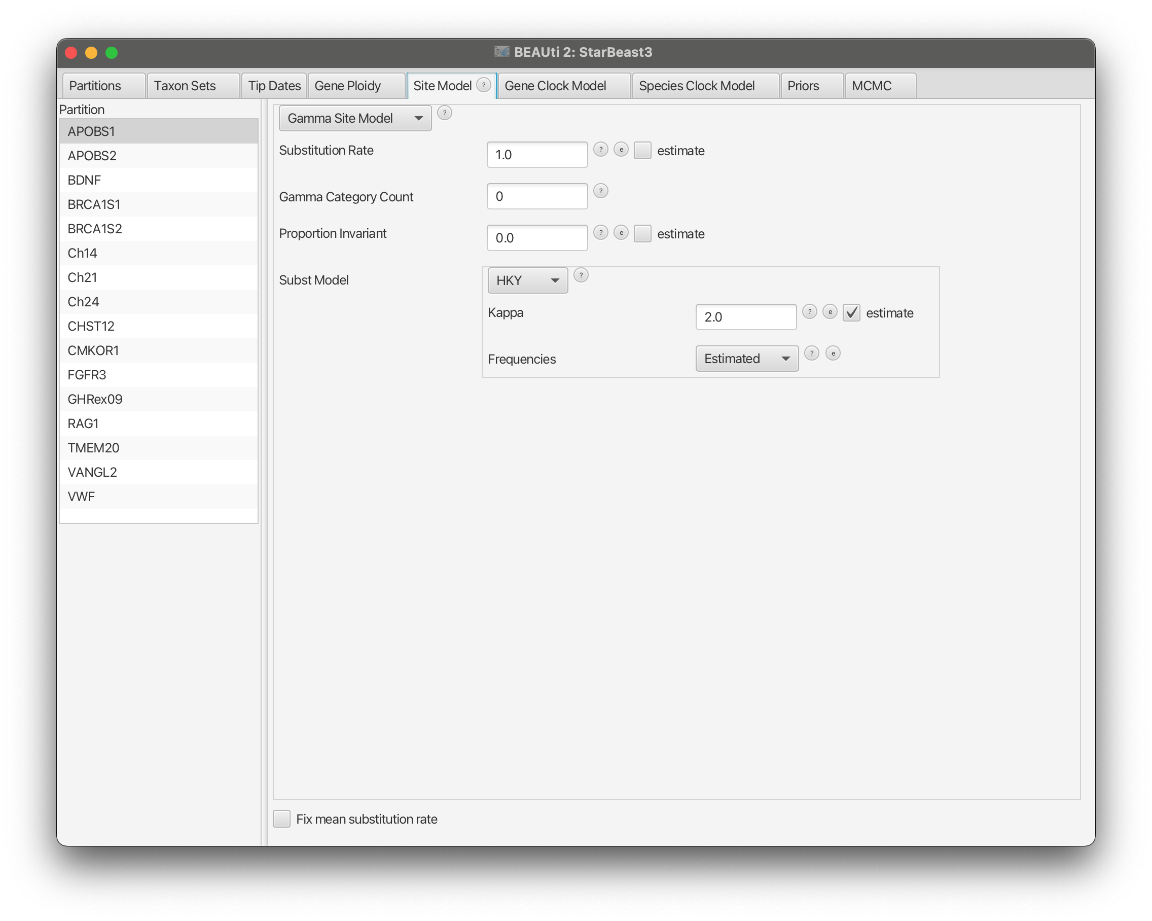 This set up ensures the same but independent site models for each partition. In real analyses, we may want to increase Gamma Category Count to a value between 4 and 8. Here, we will skip this step as it’s computationally costly.