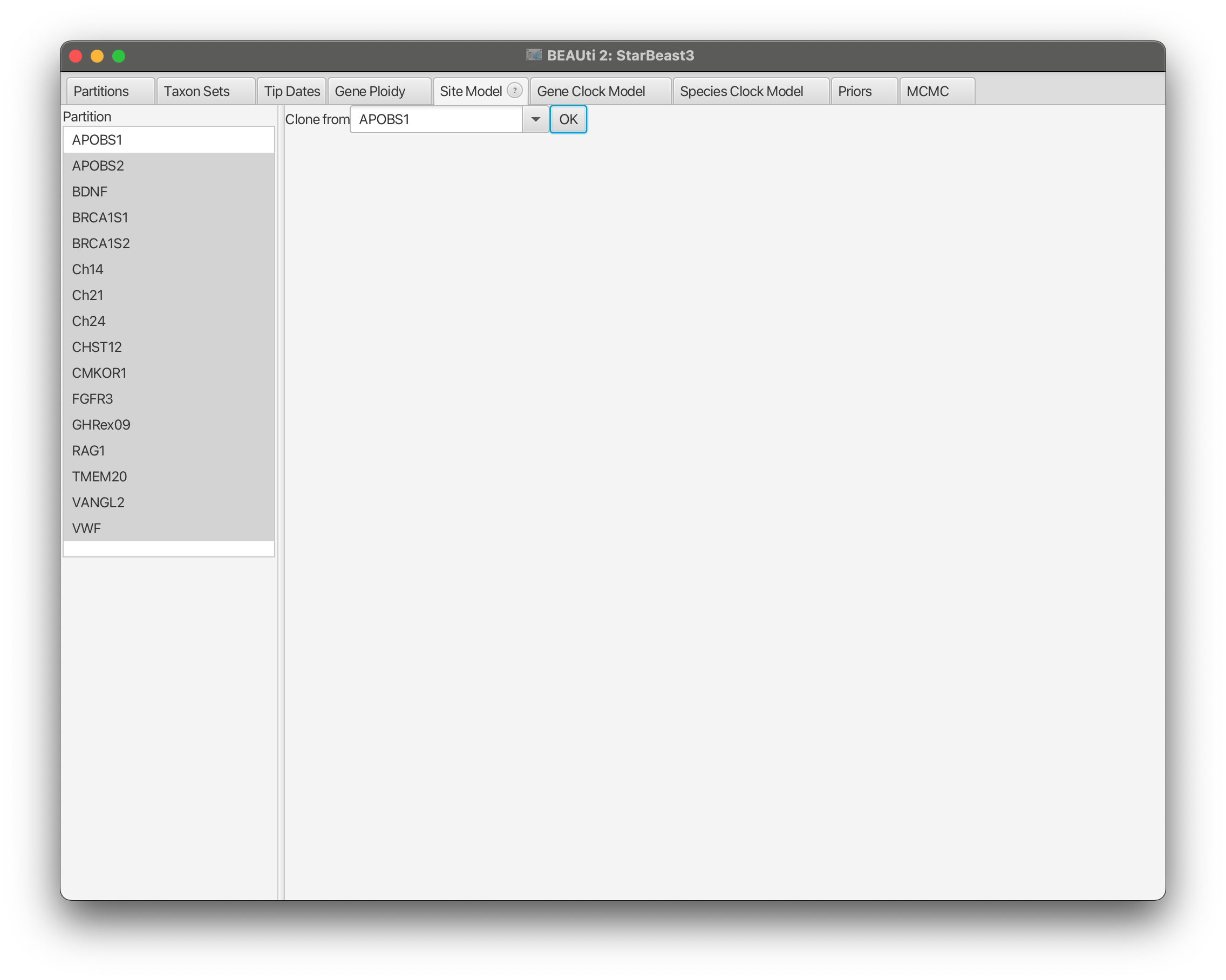 Now we will set the site model. We will set it up for the first partition and then copy the same prior settings to the remaining partitions.