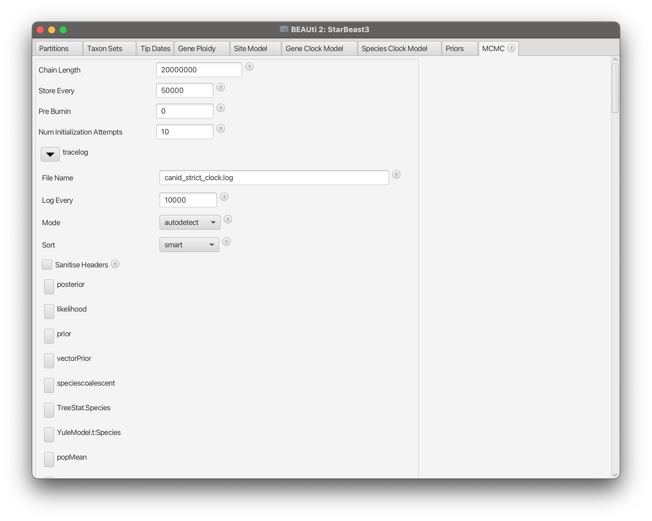 Expand speciesTreeLogger and change File Name to canid_strict_clock.species.trees