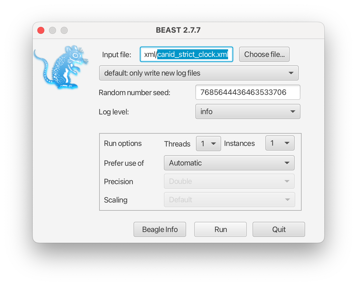 Now, we will run the XML with BEAST2. It may take around 20-25 minutes, you can choose to proceed with so-called precooked runs we provide to analyse the results while you analysis is running. But make sure to verify that your resulting log files are similar to ones we provide at the end of the run.