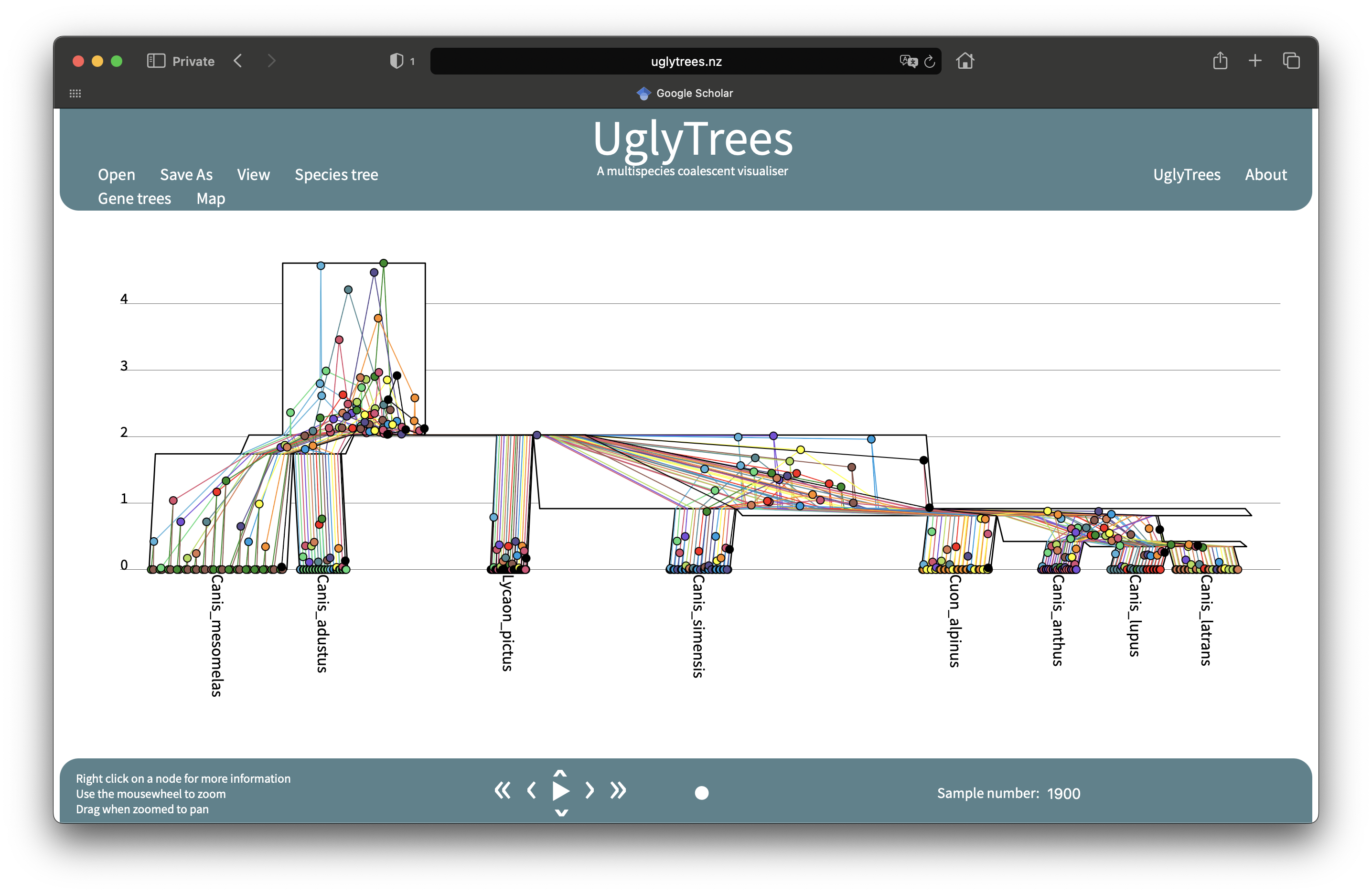 UglyTrees (https://uglytrees.nz) is a browser-based multi-species coalescent trees viewer. It is intended for exploring the posterior space of species tree and embeded gene trees.